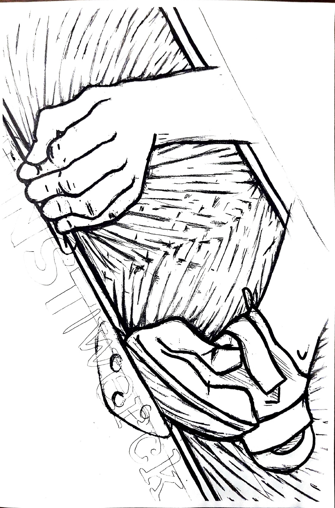 Het ontwerp is geïnspireerd door hout- en linosnedes. Om dit effect te creëren in een digitale afbeelding, teken ik een origineel ontwerp. Ik begin met potlood en zet de lijnen daarna aan met stift.